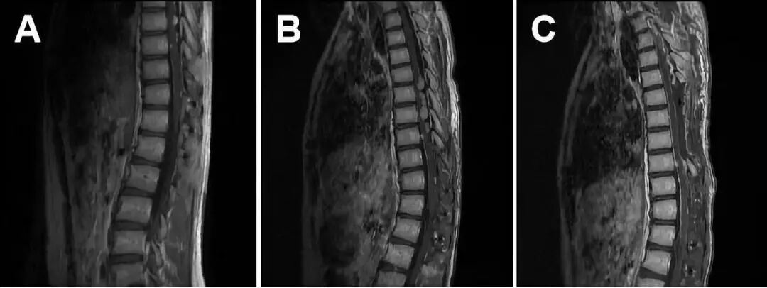 图4. A: 术后2月复查(2018-06-06)未见局部复发及转移灶明显增大;B: 术后9月复查(2019-01-08)见胸6-8水平椎管内转移灶明显增大,建议入院行手术治疗;C: 第二次术后复查(2019-01-25)切除胸6-8水平椎管内肿瘤,未见明显肿瘤残留。