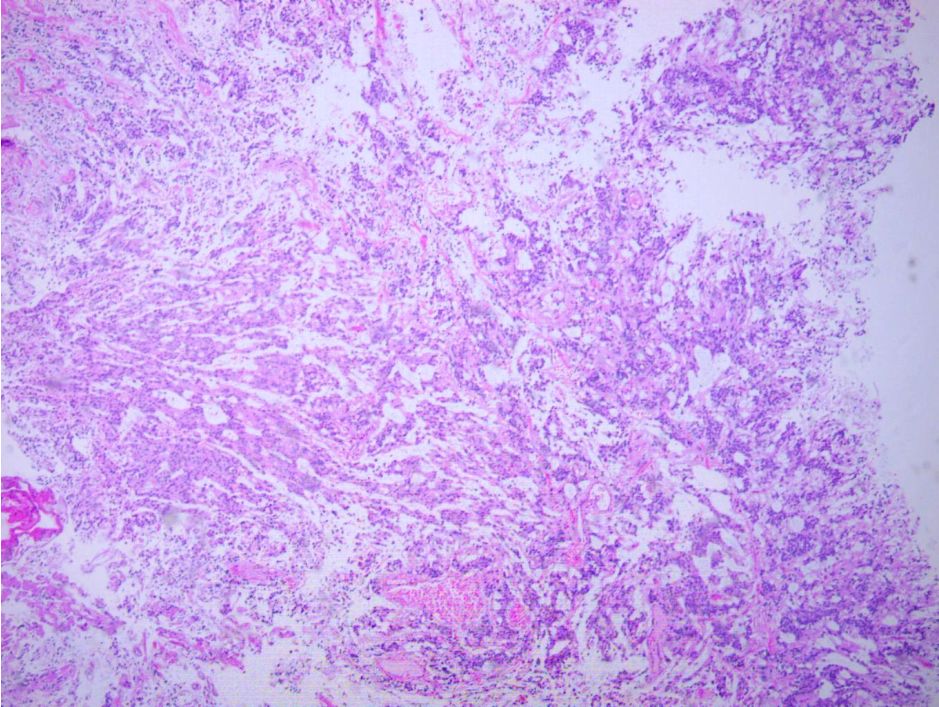 图6. 第二次手术术后常规病理结果(2019-02-17):(椎管内)粘液乳头状室管膜瘤,WHO I 级。免疫组化结果:GFAP +,S-100 -,Vimentin +,CD99 +/-,CD56 +,CK (AE1/AE3) -,EMA -,Olig-2 -,P53 散在+,Ki-67 2-5%+。特殊染色结果:PAS -,Masson -,V.G染色 -。
