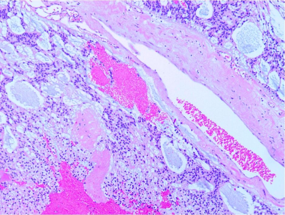 粘液乳头状室管膜瘤(myxopapillary ependymoma, MPE)主要为髓外膜内室管膜瘤,生长缓慢,WHO I级。常分布于延髓、马尾及终丝部位,在颈髓、胸髓及脑室内也有报道。椎管内MPE的临床症状以慢性腰背部疼痛常见,亦可伴随感觉减退及根性疼痛。在MRI影像学上,椎管内MPE常表现为边界清楚的腊肠形占位,灶性强化。诊断金标准仍然依赖于组织病理学结果,MPE切片镜下可见假乳头状结构、富含粘蛋白的微囊以及胶原空泡,是区别于其它类型室管膜瘤的病理学特征。[1]