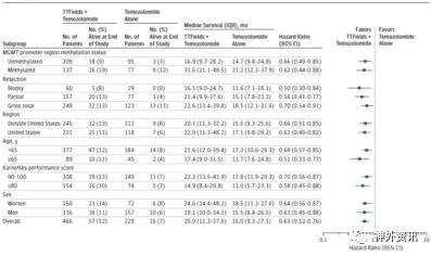 共有466名患者被随机分配到TTFields联合TMZ治疗组,229名患者被随机分配到TMZ单独治疗组。在TTFields联合TMZ组中,大多数患者为男性(68%),中位年龄为56岁,KPS为90%。MGFT启动子区域甲基化比例在TTFields联合TMZ组为36%,在单用TMZ组为54%。