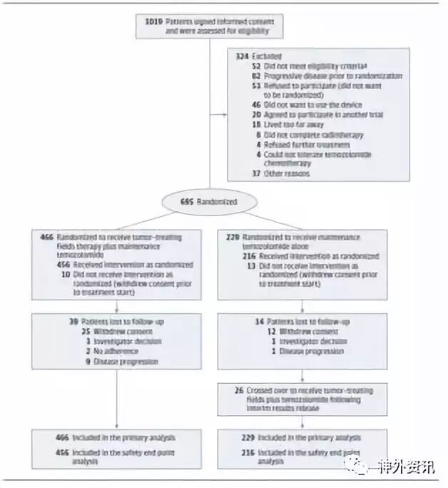 该研究为随机、开放标签的临床试验,于2009年7月至2010年6月在83个临床医学中心进行;共695例胶质母细胞瘤患者,经肿瘤切除或活检并同时完成放化疗,从诊断到随机化入组研究的中位时间为3.8个月;以2:1随机分组,归入TTFields联合替莫唑胺化疗组(联合组)466例和单一替莫唑胺化疗组(单药组)229例。TTFields治疗是通过每天18小时以上连接在便携式设备上的置于头皮的4个换能器芯片,发送低强度200kHz频率交变电场,针对脑肿瘤发挥治疗作用。两组患者均给予替莫唑胺(150-200mg/m2)化疗,每28天给药5天,共6-12周期。治疗后随访至2016年12月。该试验的初步报告于2015年发布,此次报告分析最后治疗阶段的疗效。主要研究结果为患者肿瘤无进展生存期,次要结果是患者总体生存期。同时对意向治疗人群进行评估,按亚组比较不良事件的发生状况(图1)。