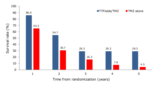 图3. 当治疗依从性>90%时,新诊断GBM患者接受TTFields+TMZ治疗的年生存率显著高于单用TMZ组,5年生存率可达29.3。