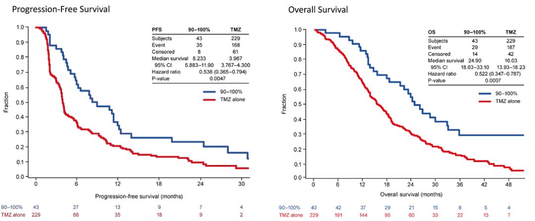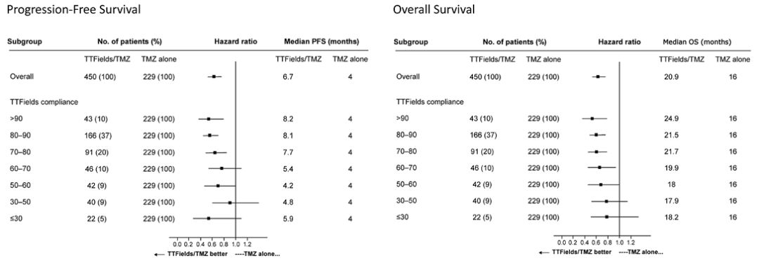 图1. 与单用TMZ相比,TTFields联合TMZ组要获得更长的PFS和OS,患者每月依从性至少应≥50%(图1)。此后随着依从性的不断增加,PFS和OS均逐步延长。