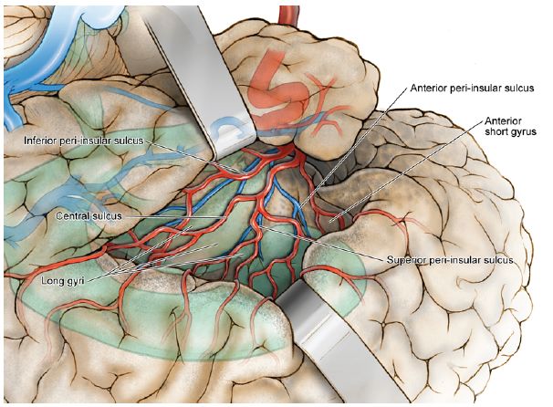 图2. 尸体解剖图显示前岛短回、后岛长回和大脑中动脉M2段岛叶穿支。岛中央沟和皮质中央沟位于同一条线上。
