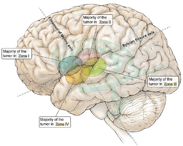 图3. Berger-Sanai根据胶质瘤位于外侧裂上下以及室间孔前后分为四区。1区:肿瘤在外侧裂上方,室间孔的前方;2区:肿瘤在外侧裂上方,室间孔后方;3区:肿瘤在外侧裂的下方,室间孔后方;4区:肿瘤在外侧裂下方,室间孔前方。
