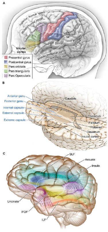 图1. 大脑皮质外侧面解剖图。A.岛叶由额叶、顶叶及颞叶覆盖。三角区(绿色),岛盖部(紫色),中央前回(红色)位于岛叶前部;B.尸体解剖断层显示位于岛叶下层的最外囊、屏状核、外囊、壳核、苍白球、内囊和丘脑;C.MRI弥散张量成像可显示腹侧和背侧语言纤维束。额枕下束和钩束均穿过岛叶的皮质下区。ILF:下纵束;SLF:上纵束。
