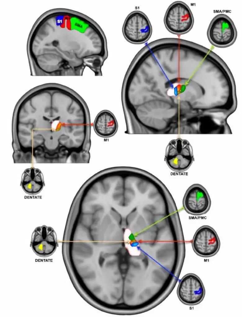 图1. HARDI显示对侧小脑齿状核(黄色)投射连接至丘脑核团的相应位置。S1:初级感觉皮质(蓝色);M1:初级运动皮质(红色);SMA:辅助运动皮质(绿色);PMC:前运动皮质(绿色)。