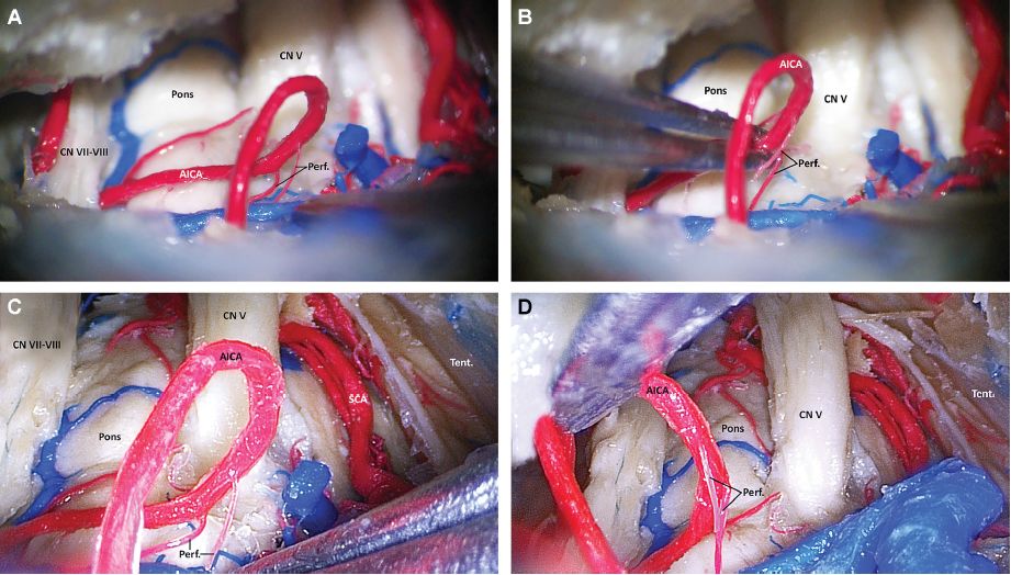 图2. 经乙状窦后入路暴露小脑桥脑角区。A、B图为显微镜下和C、D图在神经内镜下观察起源于AICA的I型穿支血管,其限制责任血管的移动度。