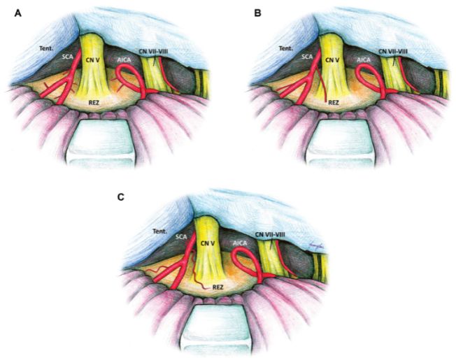近年来,大量临床和研究结果显示,微血管减压术(microvascular decompression,MVD)治疗三叉神经痛效果显著。减压手术过程中,穿支血管可能限制责任血管的移动,导致无法达到减压的目的。只有做到责任血管从三叉神经处移离,同时植入垫片不触及三叉神经根时效果更佳。但是,目前对三叉神经周围穿支血管的详细解剖和与手术的相关意义缺乏了解。美国威尔康奈尔医学院神经外科的Paolo di Russo等通过尸头解剖观察三叉神经根周围穿支血管对移动小脑上动脉(superior cerebellar artery,SCA)和小脑前下动脉(anterior inferior cerebellar artery,AICA)的影响,其结果发表于2018年12月的《Oper Neurosurg (Hagerstown)》在线上。