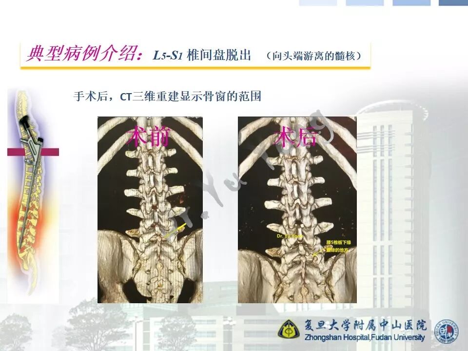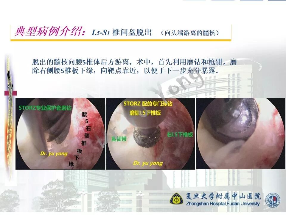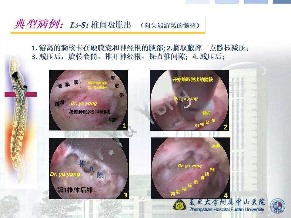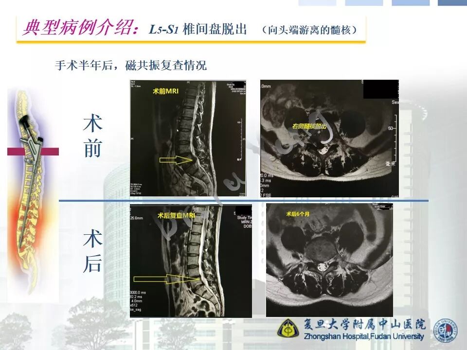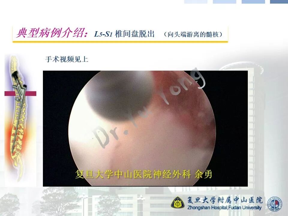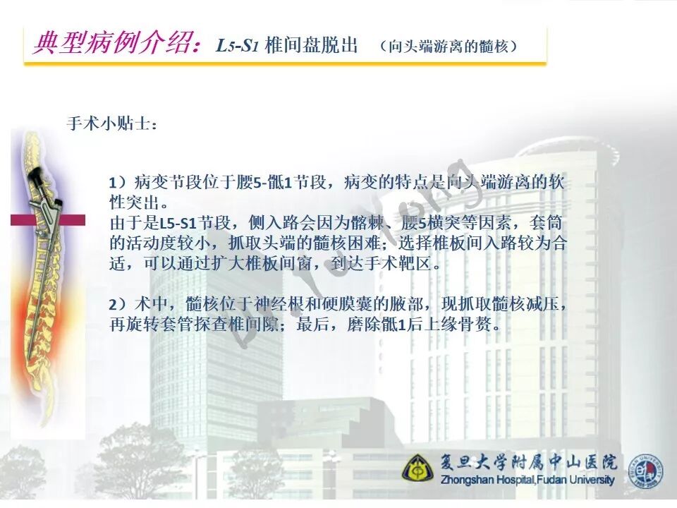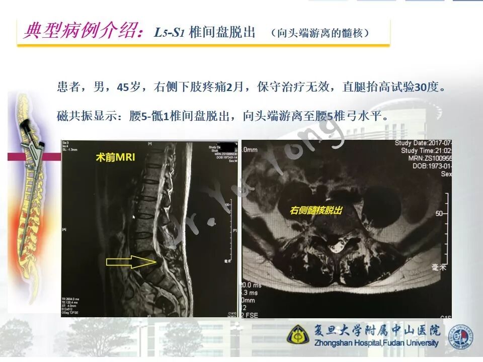 随着内镜技术以及手术器械的进步和发展,经皮内镜腰椎手术的适应症大大扩展,几乎可以处理各种类型的突出髓核。但是,即便如此,对于脱出的髓核向头端或者尾端游离的,仍然需要在术前和术中认真对待。根据不同的情况,需要选择不同的入路和处理技巧。由于术中动力的普及,椎板间入路是我们处理游离髓核的良好选择,可以通过扩大椎板间窗(甚至采用椎板入路),精准到达靶区。本节我们介绍一例腰5-骶1向头端游离的髓核脱出病例。
