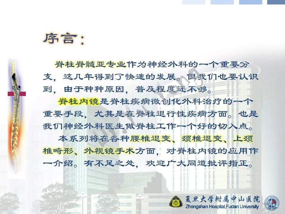 神经外科医生从事脊柱工作,任重而道远,但功在后人,利在患者;要想顺利开展,离不开医院和科室的支持,我做了点工作,首先要感谢中山医院和闵行医院领导支持以及神经外科张主任、徐主任和科室同仁的齐心相助。尤其可贵的是,在中山医院温容宽厚的氛围中,我得到了骨科脊柱同行的无私帮助和指点,从中,我获益良多。每每想来,使我深感幸运和温暖!