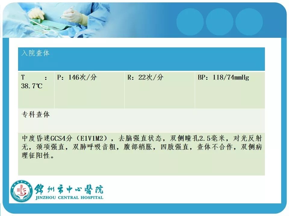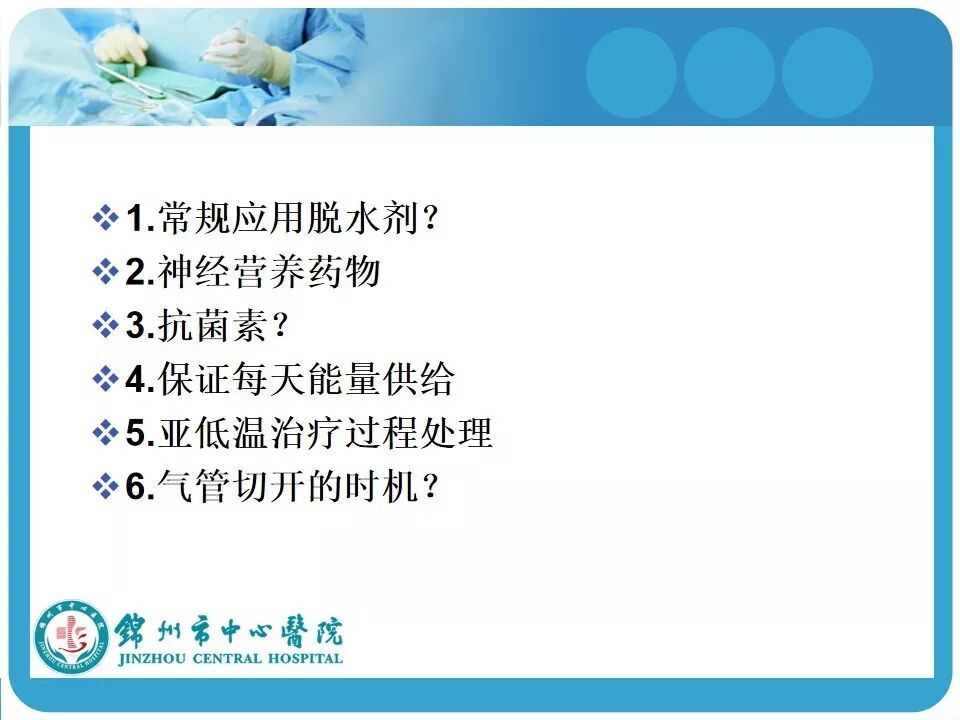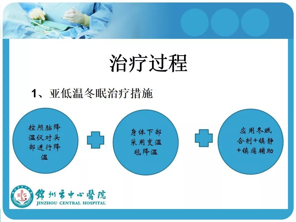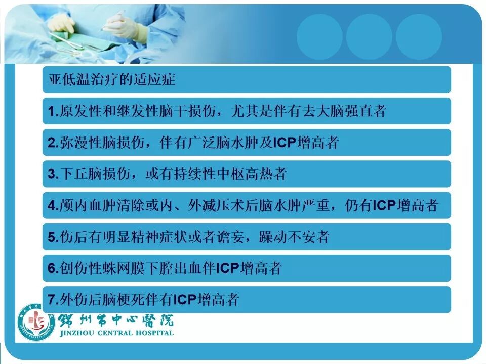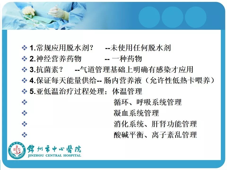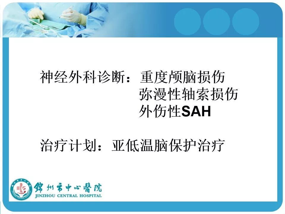 3. 亚低温的使用。患者因车祸入院时心率146次/分,血压118/74mmHg,考虑创伤患者的因素在使用低温冬眠前应评估患者的血流动力学是否稳定。另外,最好有带脑温监测的颅内压探头,既可监测颅内压和脑温,又可指导亚低温的实施和复温;