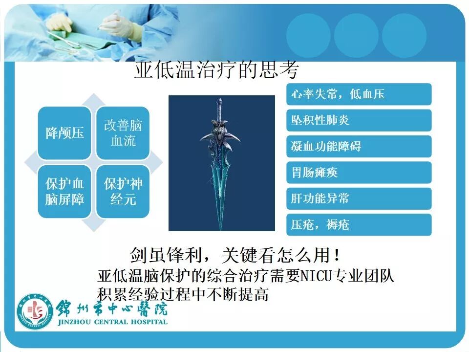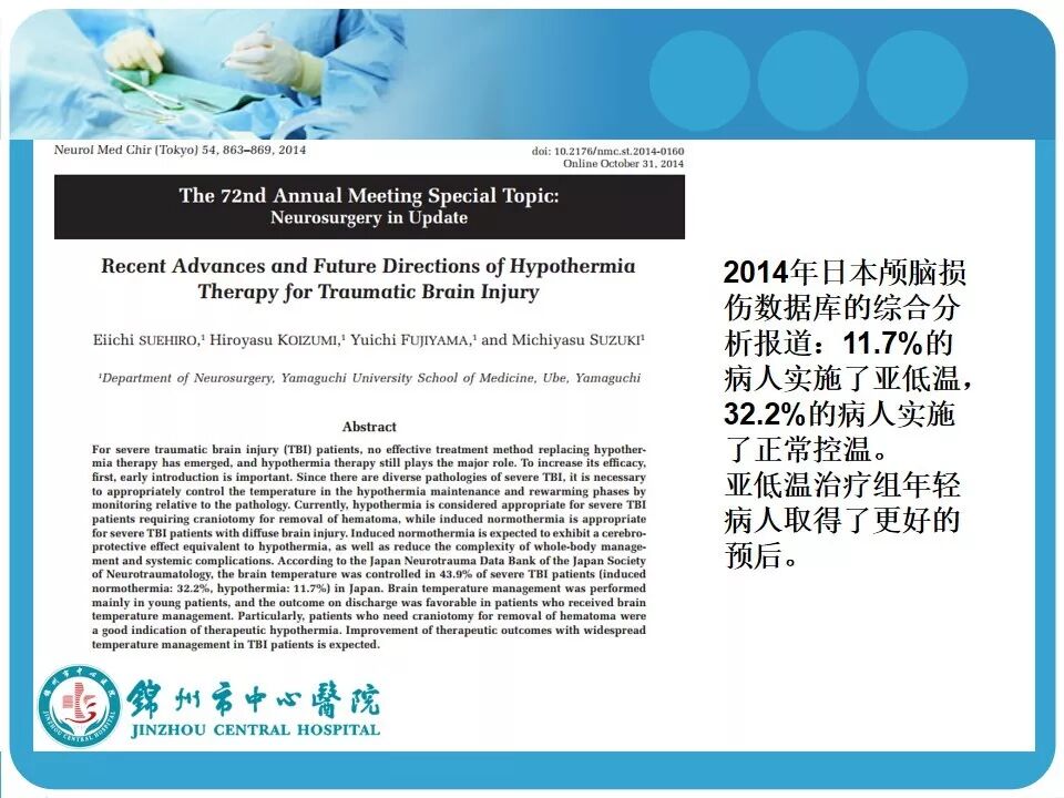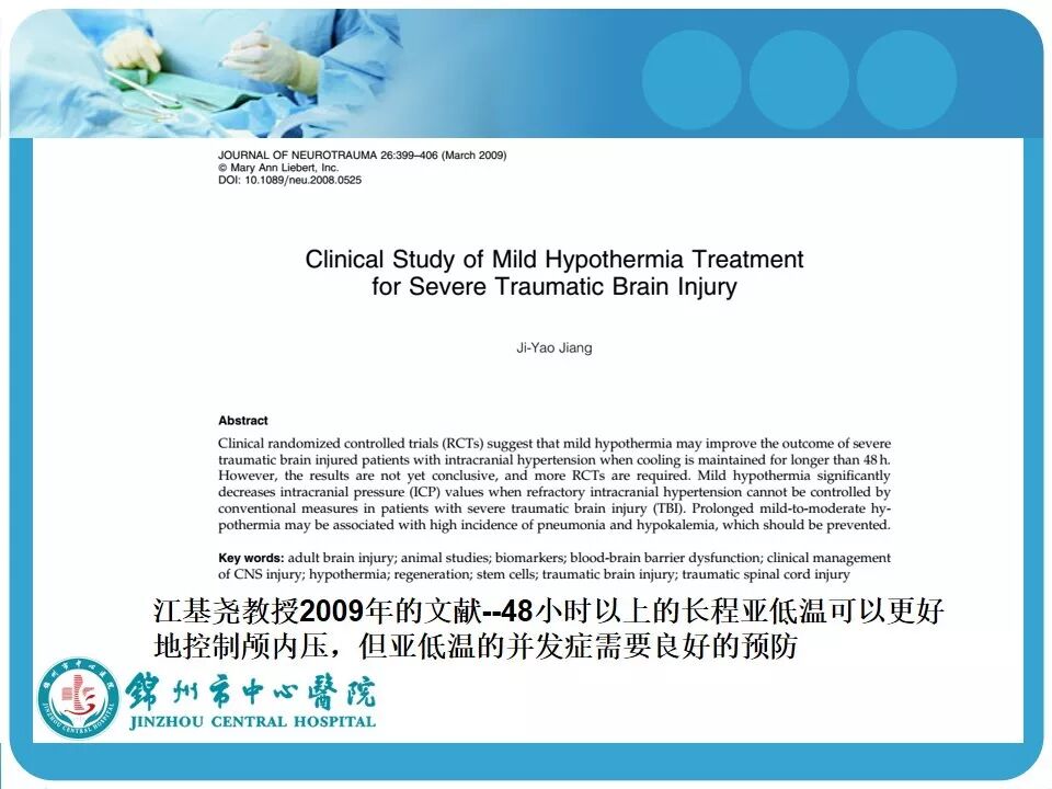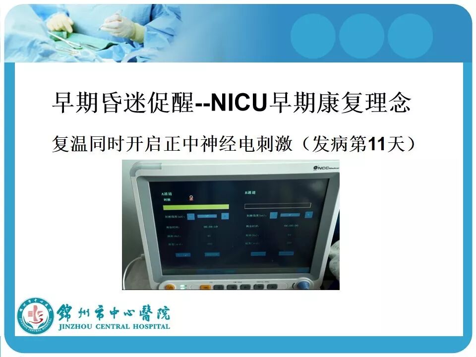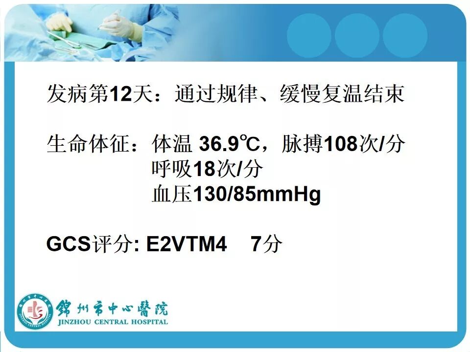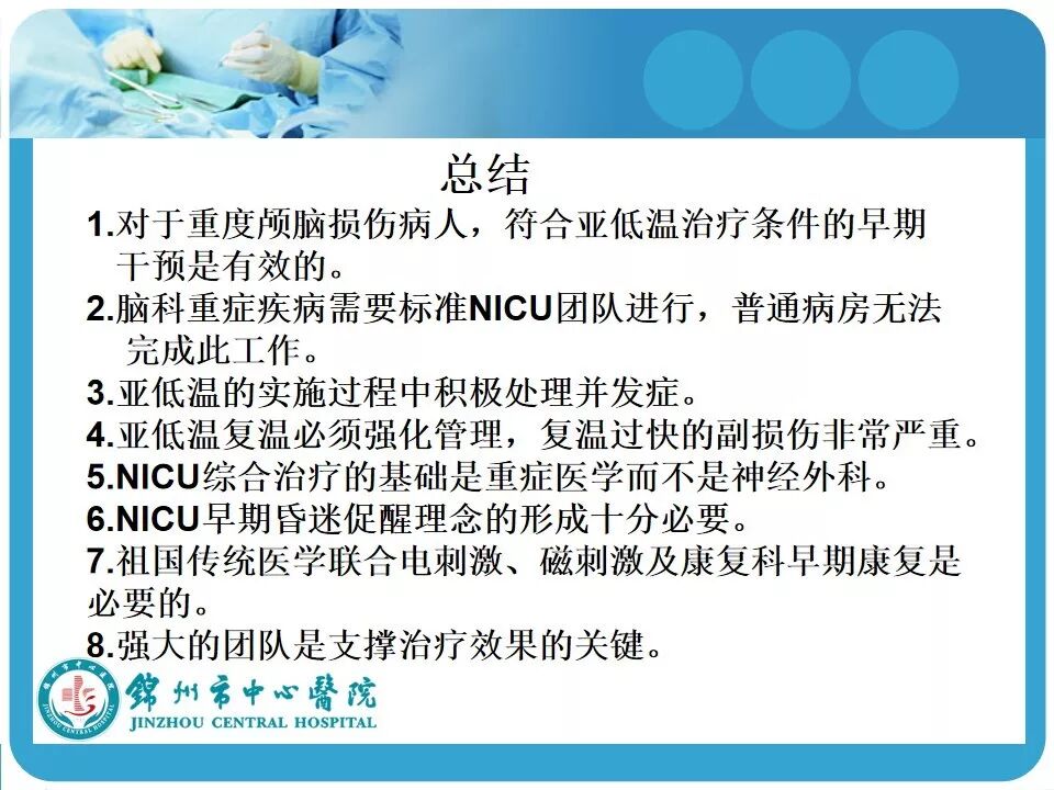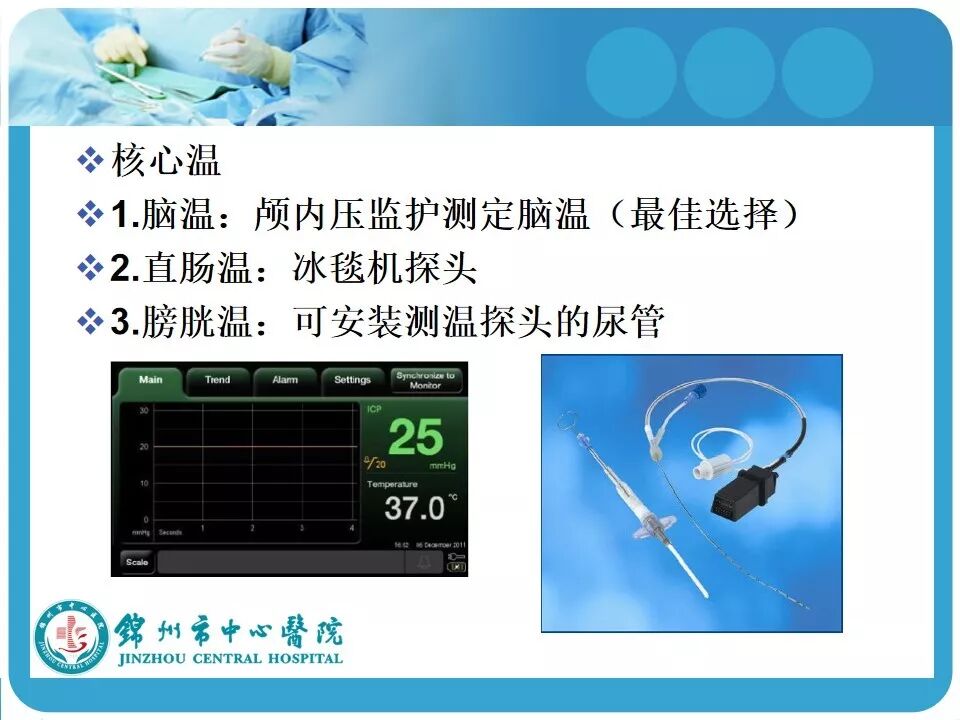 3. 亚低温的使用。患者因车祸入院时心率146次/分,血压118/74mmHg,考虑创伤患者的因素在使用低温冬眠前应评估患者的血流动力学是否稳定。另外,最好有带脑温监测的颅内压探头,既可监测颅内压和脑温,又可指导亚低温的实施和复温;