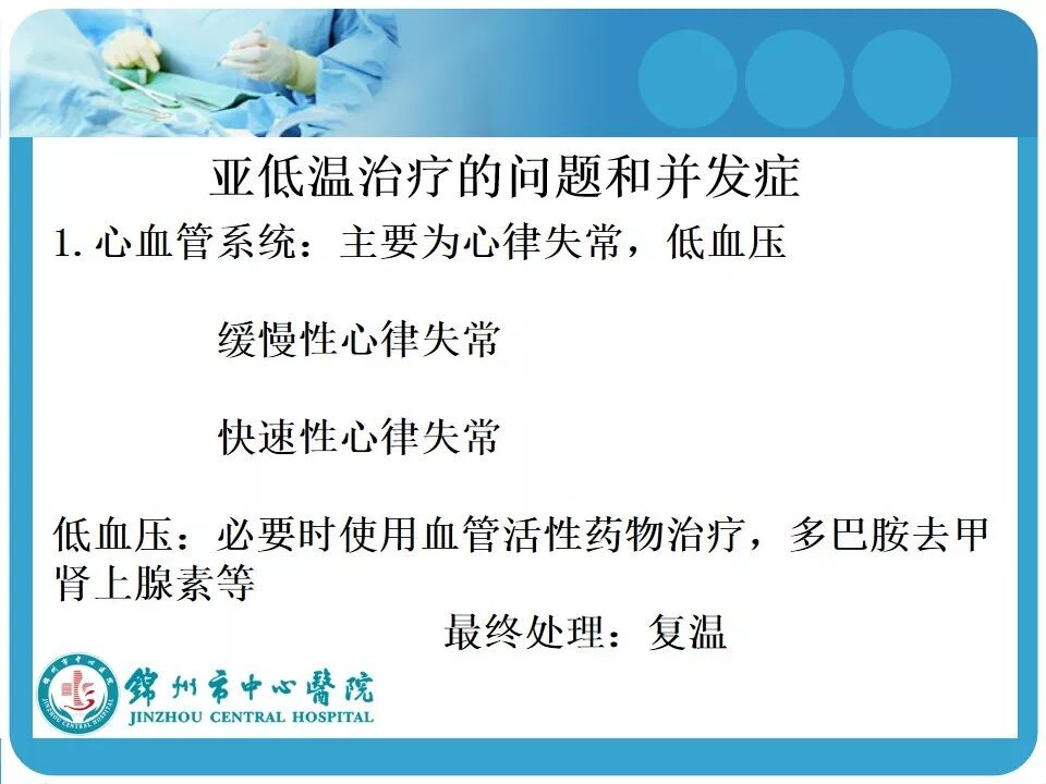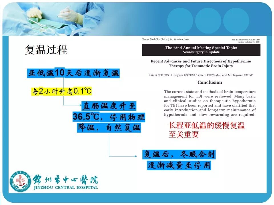 6. 患者复温的时机未具体说明,最好在脑水肿渡过后复温,另外,文中提到“每2小时升高0.1℃ ”,在临床实践中往往难以控制,一般认为每4小时升高1℃即可;