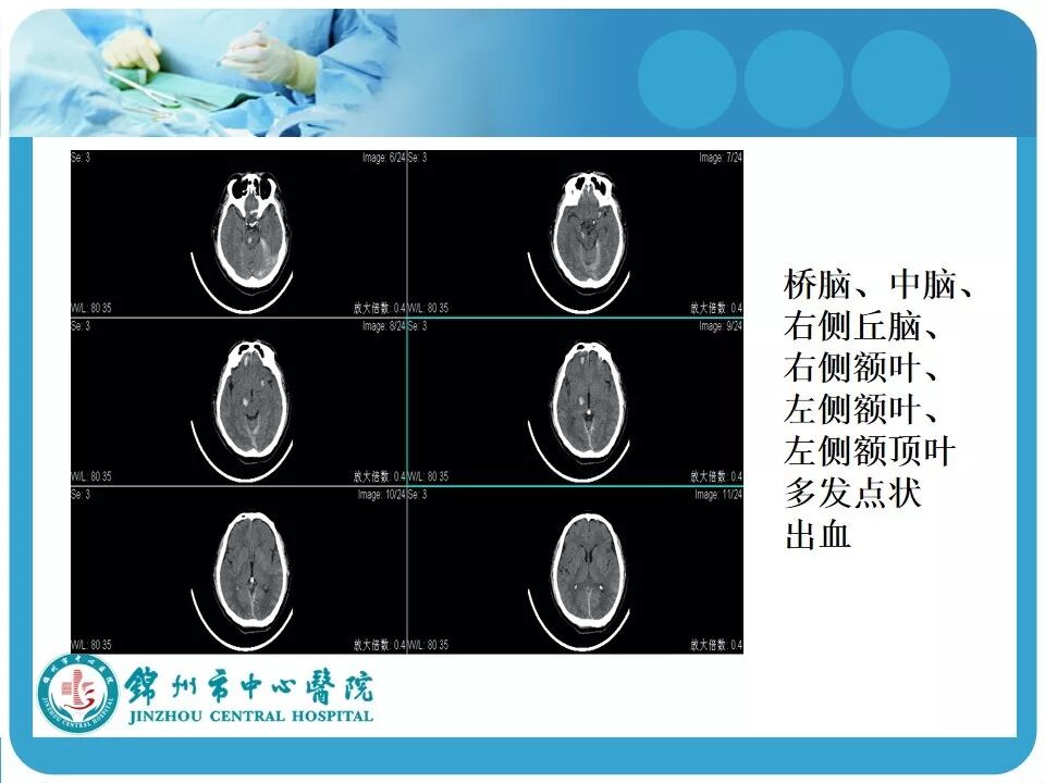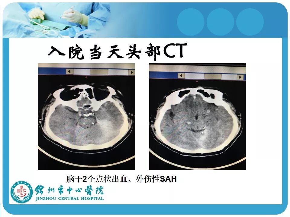 2. 弥漫性轴索损伤(DAI)的影像学诊断。单纯CT图像不能直接显示脑内白质纤维的损伤,如情况容许,行MRI检查(DWI或DTI成像)对病情的评估更有帮助,可能患者的损伤远比CT上几个出血点严重;