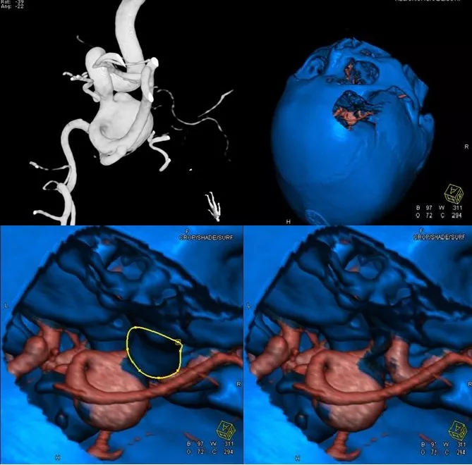 其中右侧颈内动脉眼段动脉瘤(约13.8*14mm大小,瘤颈8.04mm)。和家属沟通病情,告知介入和开颅手术两种治疗方式的风险利弊后,患者家属选择开颅右侧眼动脉段动脉瘤夹闭手术治疗。
