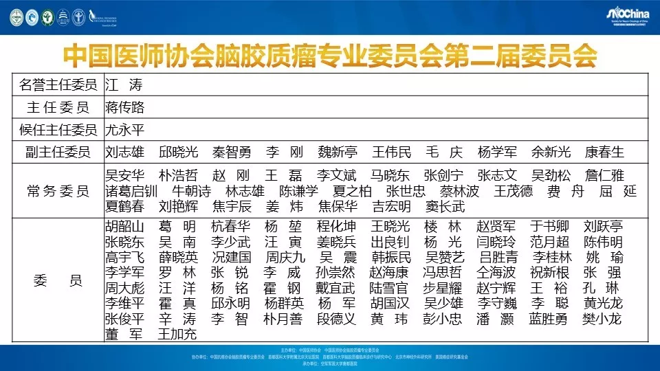 本次大会期间成功召开了中国医师协会脑胶质瘤专业委员会第二届委员会换届会。首都医科大学附属北京天坛医院神经外科副主任、委员会首任主任委员江涛教授当选名誉主任委员,哈尔滨医科大学附属第二医院神经外科主任蒋传路教授当选主任委员,江苏省人民医院神经外科主任尤永平教授当选候任主任委员,王伟民教授、毛庆教授、刘志雄教授、李刚教授、杨学军教授、邱晓光教授、余新光教授、秦智勇教授、康春生教授、魏新亭教授当选副主任委员(按姓氏笔画为序),屈延教授当选总干事,常务委员和委员总名单详见下表。
