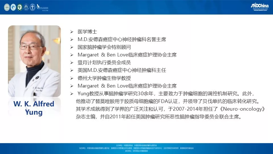 哈佛医学院Patrick Wen教授在大会中以“胶质瘤治疗的机遇和挑战”为题目,报告内容主要包括两大方面,第一是胶质瘤母细胞瘤靶向治疗和免疫治疗的前瞻性研究;第二是阐述IDH突变的较低级别胶质瘤新的治疗方法。 对于GBM靶向治疗方面, Patrick Wen教授首先从MGMT启动子甲基化的GBM患者能从TMZ化疗获益的研究开始,接着介绍了最近在柳叶刀杂志中刚报道的MGMT启动子甲基化GBM患者能从洛莫斯汀联合替莫唑胺化疗延长生存期的研究。Patrick Wen提出GBM靶向治疗进展缓慢的原因在于研究模型缺乏、血脑屏障、复杂的信号通路、肿瘤异质性和肿瘤微环境等。最后,Patrick Wen教授系统地概括了EGFR扩增/变异、BRAF V600E突变、DRD2/H3K27M突变、MET、PI3K/mTOR、CDK4/6和IDH突变等靶点的靶向治疗研究进展。Patrick Wen教授从疫苗治疗、CAR-T治疗、免疫检查点抑制治疗和联合病毒治疗等方面概述了GBM免疫疗法的研究进展。而对于较低级别胶质瘤疗法,Patrick Wen教授主要讲述了针对IDH突变的靶向治疗研究,如AG120、AG881、PARP抑制剂和针对IDH突变后导致的异常代谢通路为靶点的研究。总体来说,Patrick Wen教授认为免疫治疗和联合病毒治疗以及IDH突变靶向治疗非常有前景,但仍然需要克服很多难题,如肿瘤异质性等。