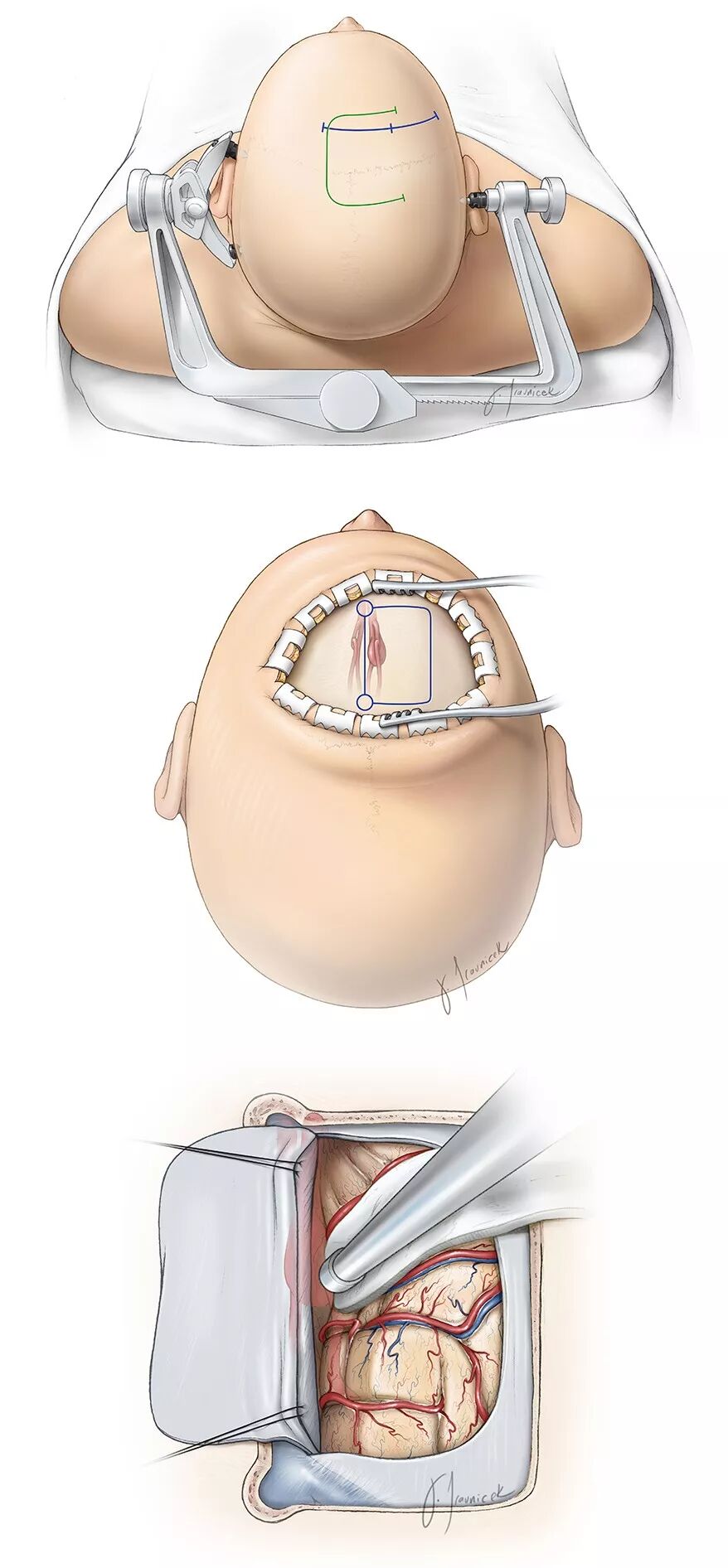 由于这类动脉瘤所在的位置恰好在纵裂内,因此较为容易处理,患者取正中位,并且颈部与水平成15度。需要根据导航资料对纵裂入路稍作调整,导航的帮助非常大,但术前通过影像学分析动脉瘤相对于矢状平面与冠状缝的位置信息。随后进行旁矢状窦额部开颅(5-6cm长),暴露上矢状窦,若骨窗开小了,可能会限制术者的工作角度以及难以处理异常的旁矢状窦静脉。