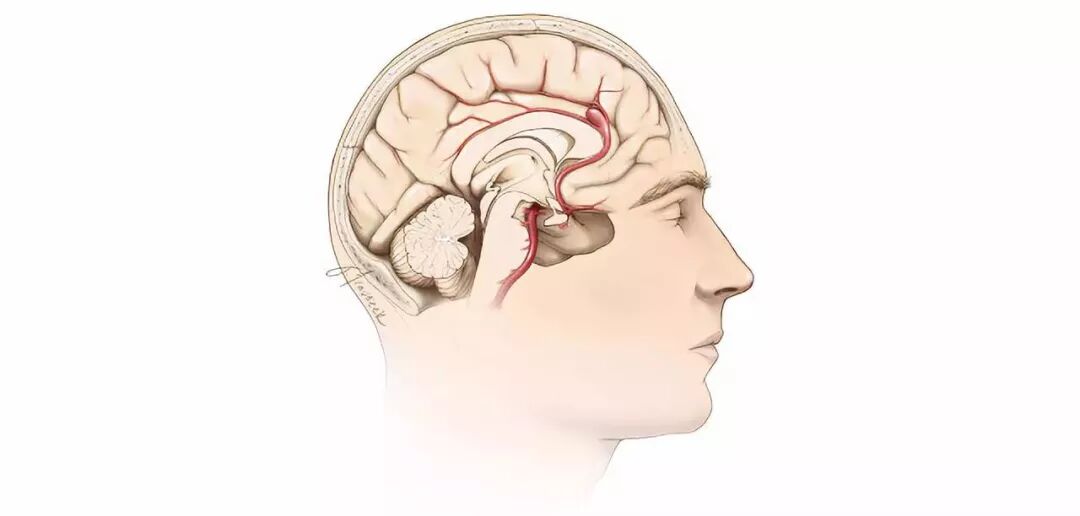 图2. ACA发自于颈内动脉,折向前内绕至视神经背部,此为A1段,同侧及对侧A1段通过ACoA相连接,ACA远端至ACoA之间的动脉被定义为胼周动脉,胼周动脉进入纵裂后持续上升自大脑半球表面,随后折入胼胝体的表面,位于大脑镰的下方(该图由Rhoton教授提供)。