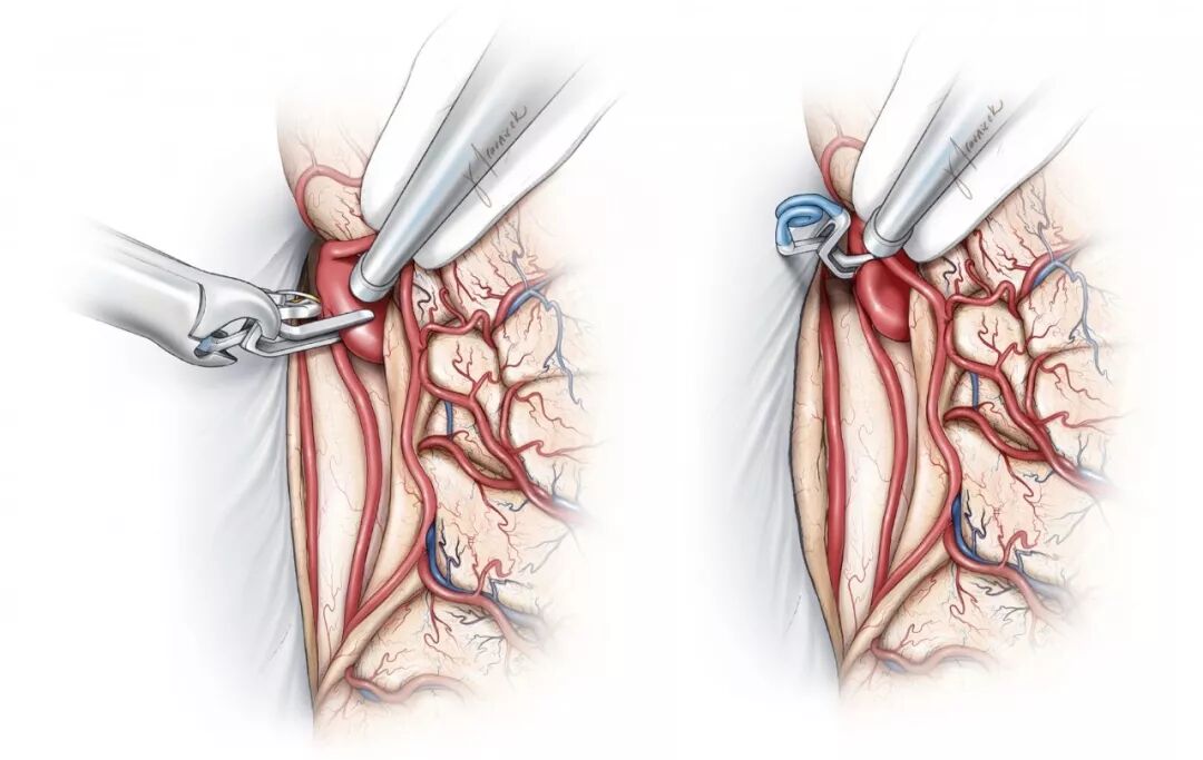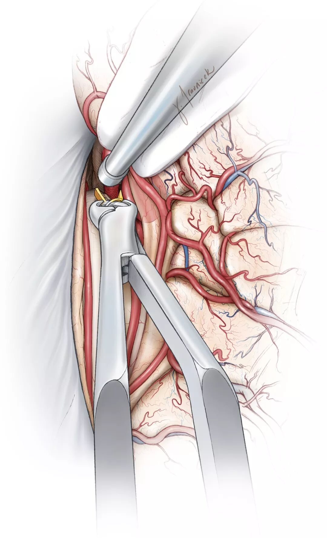 术中应该辨认好动脉瘤周围相邻的血管的远端与近端,同时保护好血管近端,这个部位的动脉瘤常包含了一个复杂的动脉瘤颈,并且合并了远端及近端的细小血管。在移动动脉瘤顶之前,术者得放一个临时夹来检查瘤颈。