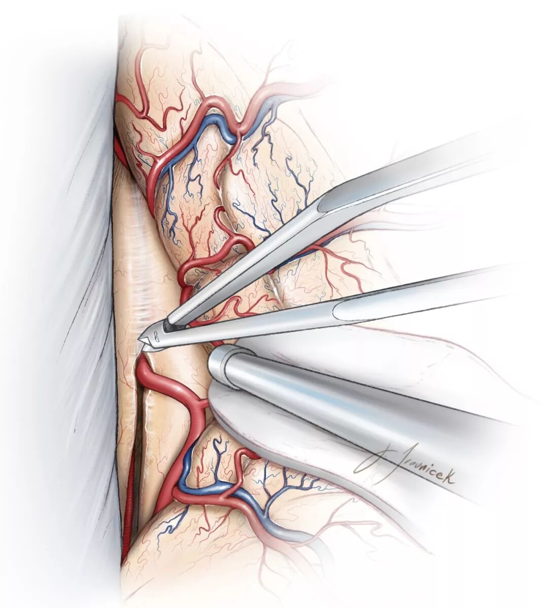 悬吊硬膜,保护上矢状窦及桥静脉,如有必要,可以牺牲部分浅静脉以获得更大的纵裂操作空间。部分与蛛网膜缠绕于一起的浅静脉则没必要去损伤它,导航图像可以引导术者进一步操作。如果没有导航图像,原则上,术者通过正常的血管起始端朝着动脉瘤的方向进行解剖,从而保留并控制血管近端,动脉瘤离ACoA越近,则越有必要从血管的近端及下端进行入手。