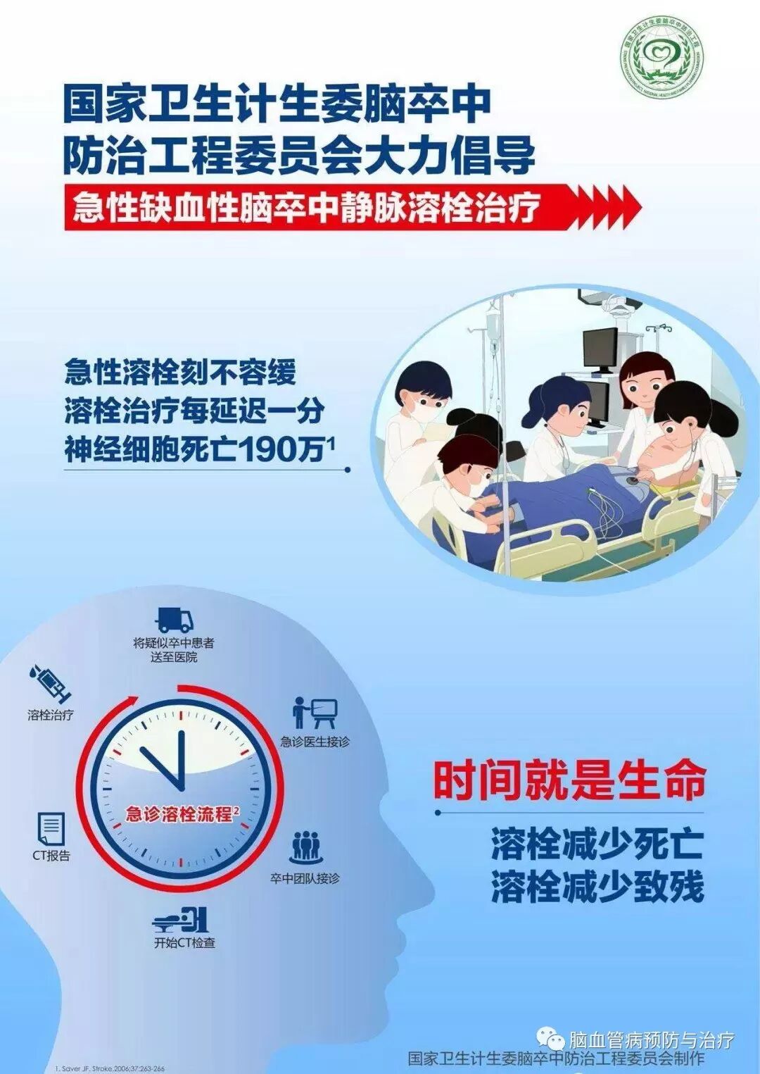 开通治疗减少死亡,免除后遗症,减少致残。延误减少一分钟,生命挽救一星期。每增加15分钟,无残疾生存的可下降10%。卒中患者的每一秒钟都如金子般珍贵!