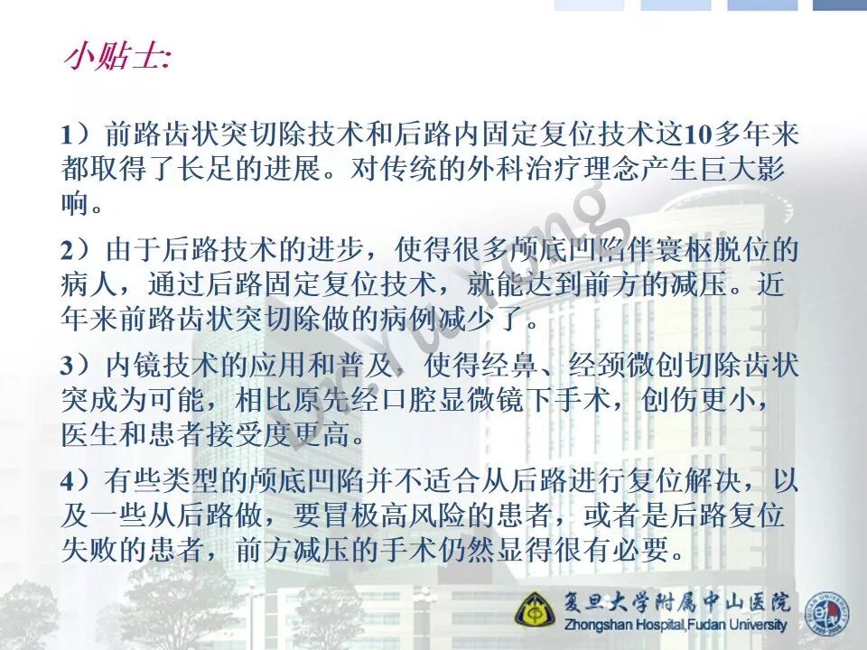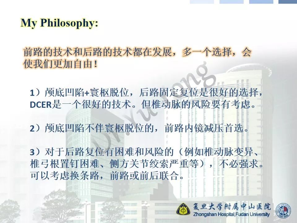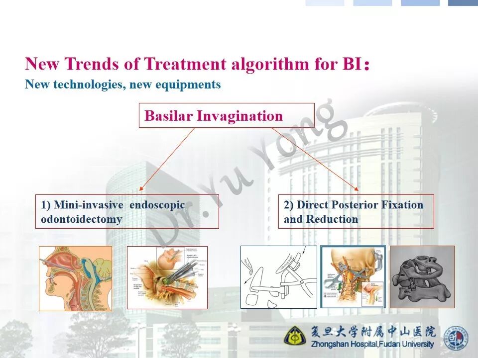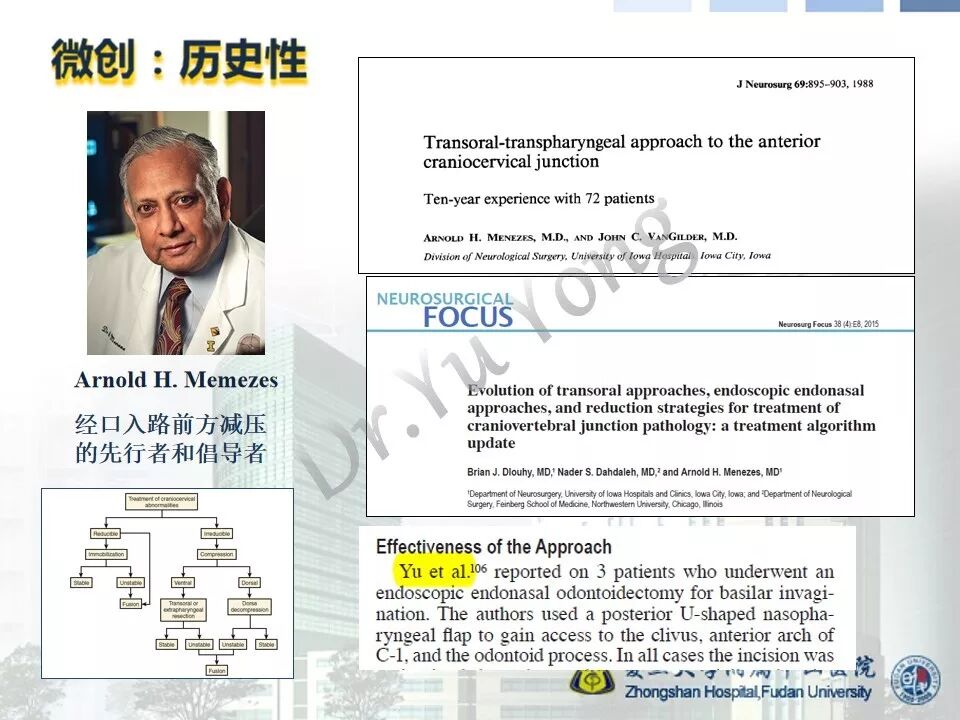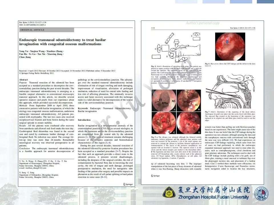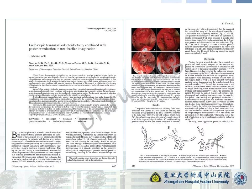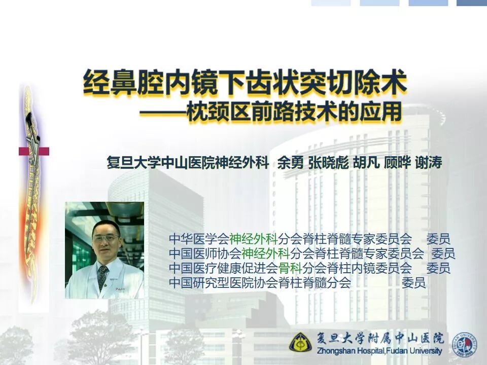 经常和骨科脊柱医生交流脊柱内镜,在经皮穿刺椎间孔镜方面,我向他们学习了很多宝贵的经验。他们更愿意在经皮内镜的深度去思考,例如尝试镜下融合等等。神经外科医生的自身培训和经历不同,我更加倾向在内镜手术的外延扩展方面去思考。经鼻内镜下齿状突切除手术就是内镜脊柱方面的一个应用。 中山医院开展这一手术至今正好10年。我们能开展这个工作,离不开中山医院这个土壤,离不开我的师兄张晓彪教授的引领。09年底,他带领胡凡教授和我做了第一例完全内镜下的经鼻腔齿状突切除术。这个术式最早是2005年匹兹堡Kassama在Neurosurgery上报道的,当时世界上总共没有几例报道。我们就是反复研读世界上仅有的几篇文献,把这个手术完成了。我个人对处理颅颈交界腹侧畸形的各种术式的理解和运用,也是从那个时期开始积累。现在,这一手术已成为中山神经外科的一张名片。每年,都有骨科脊柱医生将一些困难病例转诊到我这里。这件事对我的思维影响比较大,我们神经外科开展脊柱工作,一定要有自身的特点。 本期我就此技术做一简单介绍。值得注意的是,颅颈交界区解剖结构比较特殊,而且涉及复杂的稳定性问题,外科处理方法有后路、前路、前后联合。要想把此区域先天畸形处理好,需要对上述问题有个全面深入的认识。我在做这个工作初期,当时阅读了不下200篇相关文献(传统的经口、内固定复位等等),有些甚至是上世纪5、60年代的文献,对不同的手术起源、转承都了解了,有利于理解现在的发展方向。 余勇 复旦大学附属中山医院神经外科 余勇,复旦大学附属中山医院神经外科副主任医师。中华医学会神经外科分会脊柱脊髓专业委员会委员;中国医师协会神经外科分会脊柱脊髓专业委员会委员;中国研究型医院协会脊髓脊柱专业委员会委员;中国医疗保健国际交流促进会骨科分会脊柱内镜学组委员;上海医学会神经外科分会脊柱脊髓学组委员;上海医学会神经外科分会青年委员;上海市中西医协会神经外科专业委员会常务委员。先后赴美国、德国和台湾地区做脊柱脊髓访问学者,专业研究脊髓、脊柱的微创手术治疗。对颈椎病、腰椎病、脊髓空洞、椎管肿瘤、颅颈交界区疾病的诊治具有较高的学术水平,对脊柱内镜有较深入的研究,尤其擅长腰椎间盘突出、颈椎间盘突出的内镜微创治疗和经鼻内镜下齿状突切除手术。 神经外科医生从事脊柱工作,任重而道远,但功在后人,利在患者;要想顺利开展,离不开医院和科室的支持,我做了点工作,首先要感谢中山医院和闵行医院领导支持以及神经外科张主任、徐主任和科室同仁的齐心相助。尤其可贵的是,在中山医院温容宽厚的氛围中,我得到了骨科脊柱同行的无私帮助和指点,从中,我获益良多。每每想来,使我深感幸运和温暖!![]()