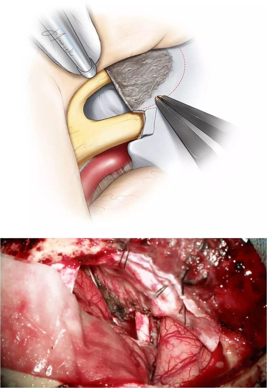 与双额入路相比,单侧额颞入路为广大神经外科医师所熟识、能够在手术早期识别视神经和颈内动脉,而且不需要开放额窦、牵拉双侧额叶和结扎矢状窦。