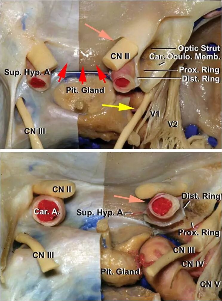 图3:鞍结节脑膜瘤(TSMs)切除术相关的局部解剖(上图)。红色箭头所指是TSMs的经典起源部位,棕色箭头指示肿瘤最常侵犯视神经管的位置,也就是视神经的内侧,这同时也是术野的盲区。图中还可以看到动眼神经(黄色箭头)毗邻前床突的切除区域。下图以冠状位展示鞍结节与周围血管的解剖关系。术中如果牺牲这些起自颈内动脉内侧壁并供应视交叉的小穿支将导致术后视力恶化甚至丧失。(图片由AL Rhoton, Jr授权)