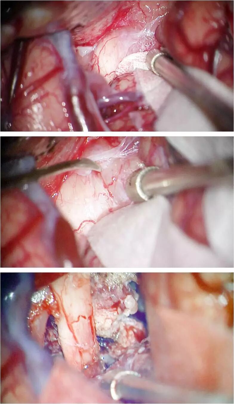 图14. 通过左侧翼点入路切除一例大型TSM。最初的探查发现视神经和肿瘤粘连很紧密(上图)。解剖蛛网膜后可逐步建立一个安全的分离界面(中图)。随后减压肿瘤并锐性分离使肿瘤能够被牵离视神经(下图)。