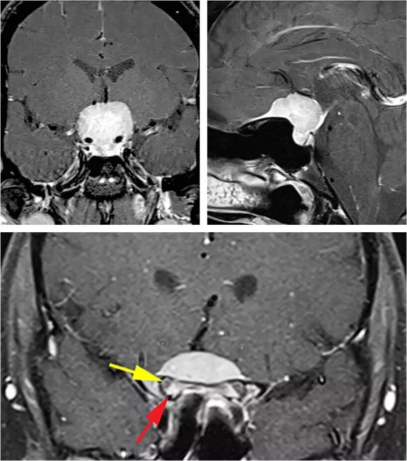 图2. 这例典型的鞍结节脑膜瘤体积大并且挤压、包绕血管,因此最适合经颅切除,而不是经鼻。肿瘤的影像学表现也非常具有特征性:鞍内不扩大(左上图)和额底可见脑膜尾征(右下图)。下图提示病变已经累及双侧视神经管,而且以右侧为甚。红色箭头指的是视管内强化的肿瘤,黄色箭头则是指被移位的视神经。