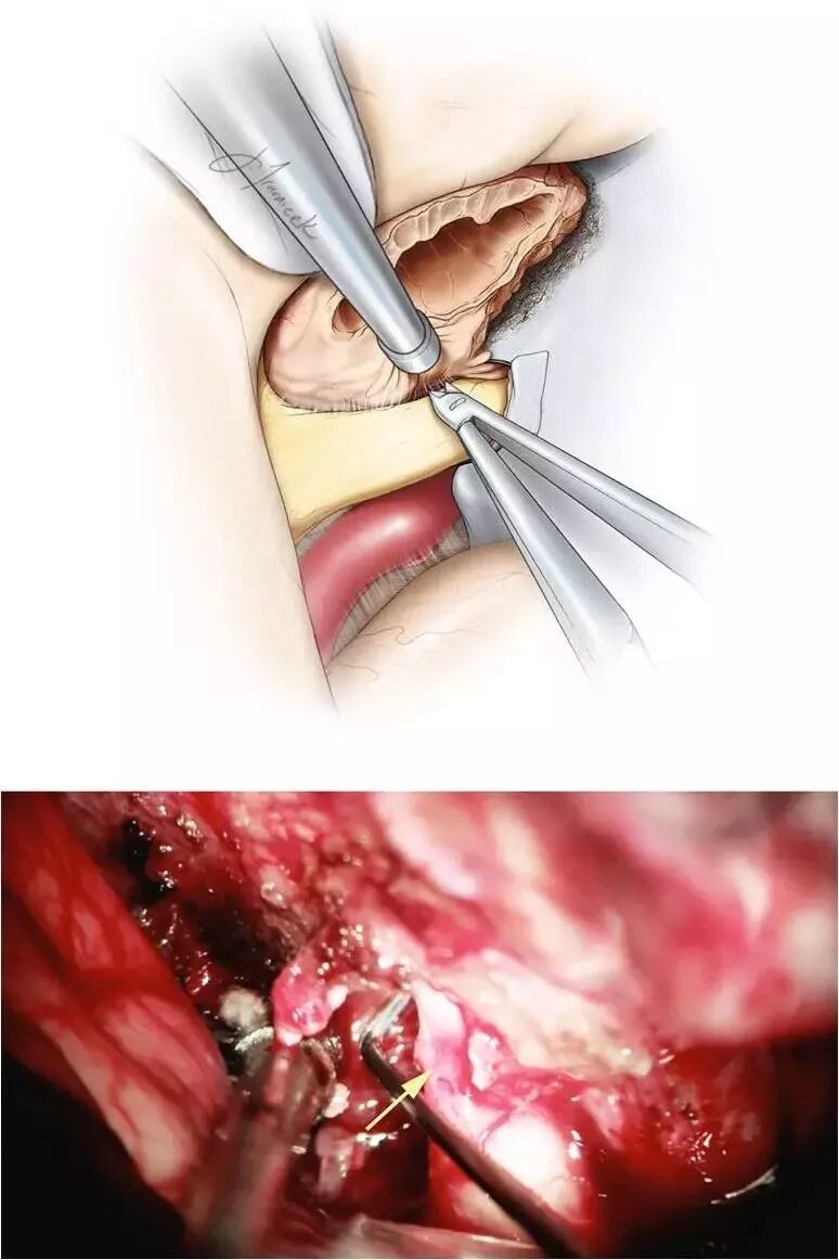 图12. 上图演示去除中空的肿瘤。视神经管的内侧部经对侧视角探查更容易(下图),管内的肿瘤通常与周围没有粘连,可以使用小的垂体抓钳取出。视神经管内的肿瘤如果有残余会出现肿胀并导致迟发性视力下降。