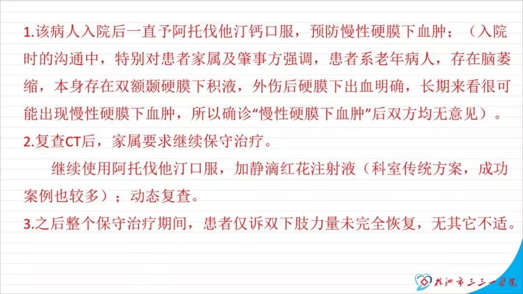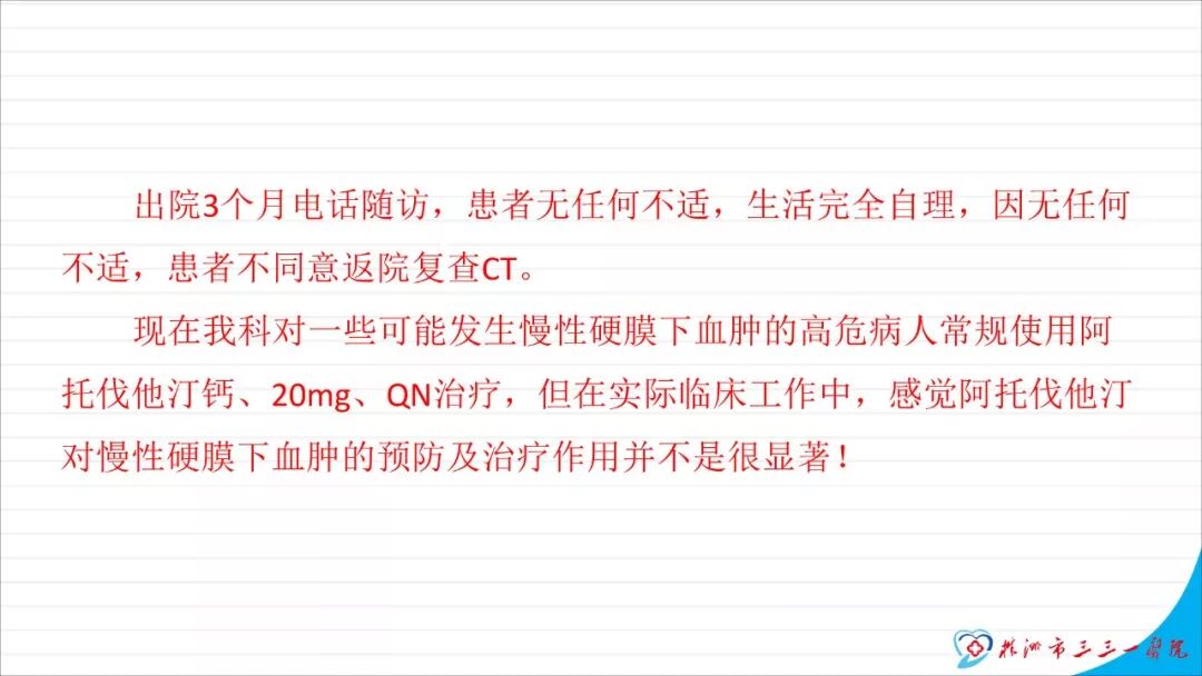 本文以“慢性硬膜下血肿自然演变一例”为题,恰当!因为此例患者系从急性硬膜下血肿自然演变而来。只是长期口服他汀没有起到预防作用。本例患者与其说是阿托伐他汀治疗慢性硬膜下血肿无效,还不如说是阿托伐他汀不能阻止急性硬膜下血肿向慢性硬膜下血肿演变的过程,当然,后续急性血肿变成慢性后,阿托伐他汀似乎也没有发挥治疗作用。需要指出的是,单药阿托伐他汀治疗急性硬膜下血肿并无成功病例报道,但是,本例报道还告诉我们,它还不能阻止急性硬膜下血肿向慢性血肿演变,值得关注。 谈到阿托伐他汀治疗慢性硬膜下血肿,我们是始创者。为此,看到作者似乎有点抱怨的情绪,我得做些解释。我们ATOCH试验,验证的是阿托伐他汀治疗慢性硬膜下血肿比安慰剂能更有效促进血肿吸收,没有发现也没有努力去验证阿托伐他汀治疗慢性硬膜下血肿100%有效,因此发生治疗无效很正常。 保守治疗的始作俑者是英国人,他们1962年就提出地塞米松治疗慢性硬膜下血肿。但是,迄今为止,无论是英国人提出的地塞米松、美国人提出的氨甲环酸或血管紧张素转换酶抑制剂,还是德国人提出的塞來西布,日本人提出的汉药,国内许多单位自行研究提出的血府逐瘀丸,作者单位的“传统”方法红花注射液治疗慢性硬膜下血肿都没有经历严格随机双盲安慰剂对照研究,也从未被大宗病例报道证实过有效。由于未被RCT(随机对照临床试验)证实过,加上一部分慢性硬膜下血肿不必治疗也可以自我吸收(这在我们ATOCH里的安慰剂组中已经观察到,但我们发表论著时没有刻意提出这一点而已),除他汀疗法之外的药物疗法被怀疑是否真具有疗效就顺理成章了。这也是我们的阿托伐他汀治疗慢性硬膜下血肿在保守治疗药物队伍中“一骑绝尘”的理由。后续西南医科大学和香港中文大学还均报道使用阿托伐他汀可以预防慢性硬膜下血肿术后复发。而且,除了有RCT结果支撑其有效性外,安全性明显优于上述各个西药又不像中药或汉药那么含糊,也使得阿托伐他汀成为目前保守治疗慢性硬膜下血肿应用最多的药物。 但毫无疑问,实践中确实屡屡有发现效果不佳的病例。为什么会这样呢?可能有2个理由: 1、确实存在一部分对他汀治疗反应不佳的患者。我们的ATOCH中,阿托伐他汀试验组就有11例患者因无效转去接受手术(对照组则多达23例); 2、ATOCH试验长达8周,有些患者家属和医生都没有耐心等待8周。也就是说,没有等到药物作用显现就转保守治疗为手术治疗。在同样状况下,即使作为发明者,我也不敢“阻扰”患者转手术治疗,因为这意味着风险转嫁。而这种“保守治疗未到时间”(这样提可能不严谨,因为没有规定时间,只有经验时间)就转手术治疗,会增加阿托伐他汀治疗慢性硬膜下血肿的“无效率”。 有鉴于此,我们团队在张建宁教授指导下,从2014年就开始优化阿托伐他汀疗法,本人以此优化的独门方法就治愈了多达200余例各种慢性硬膜下血肿患者。最近,有上海同行私下告诉我,他用类似我的优化方法保守治疗慢性硬膜下血肿多例,还没有失败过。我跟他开玩笑:“那是你治疗的病例还不够多。”实际这不是开玩笑,因为本人有失败经验。目前,我们团队正积极推进ATOCHII试验,就是要证明我们的优化疗法更加有效,期待奉献给世界一个更加好用的治疗慢性硬膜下血肿新方法。 最后需要特别指出的是,慢性硬膜下血肿与急性硬膜下血肿和亚急性硬膜下血肿并非一定有如父如子的“传承”关系。实践中,绝大多数患者都没有急性硬膜下血肿过程,尤其是老年患者第一次查影像学多数就可以确诊慢性硬膜下血肿了,患者之前并没有经历急性硬膜下血肿这种剧烈损伤过程。还有,脑转移癌可以发生类似慢性硬膜下血肿的血肿性病变,先天性蛛网膜囊肿、脑池囊肿术后常见并发症就包括硬膜下血肿。笔者诊疗慢性硬膜下血肿接近300多例,还见过教科书和个案报道没有记载的各种非脑外伤相关慢性硬膜下血肿的病例。相比于脑外伤引起的急性和亚急性硬膜下血肿,慢性硬膜下血肿是处理简单且病情稍显轻微的疾病,但其发生机制却远比急性和亚急性硬膜下血肿更为复杂,值得进一步深入研究。 江荣才 教授 副主任兼NICU主任 天津医科大学总医院神经外科![]()