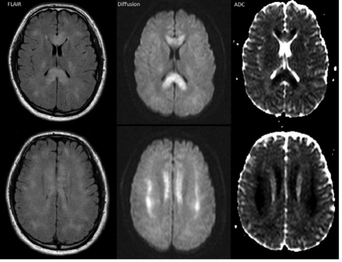 图1. MRI轴位FLAIR、diffusion和ADC成像提示整个胼胝体及双侧皮质下白质区高信号和弥散受限。