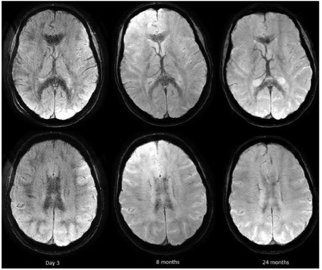 图3. 第3天、第8月和第2年的3T MRI-SWI的成像显示,出血瘀斑持续存在并随时间推移微出血灶逐渐融合。