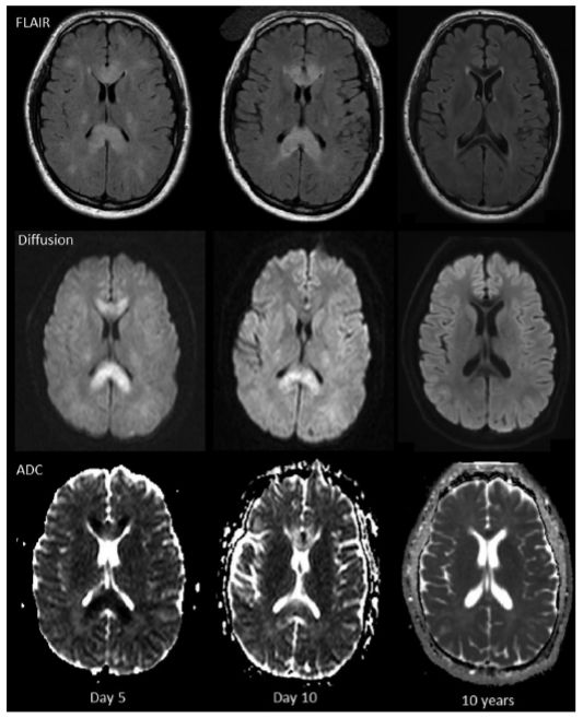 图2. 第5和第10天的1.5T及10年后的3T MRI图像。第10天FLAIR上胼胝体的信号增强,10年后消失;弥散受限程度第10天减弱,10年后消失;在第10年FLAIR上胼胝体膝部和压部的低信号由含铁血黄素沉积所致。