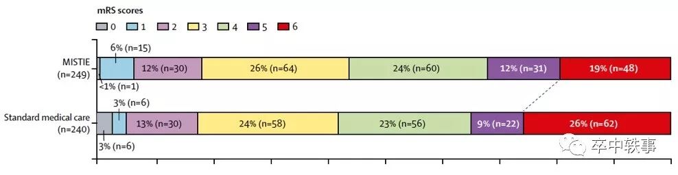 250个病人在 MISTIE 组,249个在内科治疗组。虽然手术减少了69%的血肿,但是只有50%多的病人血肿降到15毫升以下。一年后 Rankin(mRS)评分,手术组与内科治疗组 Rankin <3(好转)是45%比41%,无显著区别(下图)。7天死亡率1%比4%,MISTIE 组显著减少。