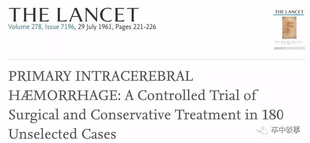 最早开颅手术清除脑血肿的临床试验是英国的 Wylie McKissock, Alan Richardson, Julien Taylor 1961年在 Lancet 上报道的(上图)。当时无 CT,180个病人分两组比较内科和手术效果,六个月后手术组死残率80%,高于内科治疗组的66%。