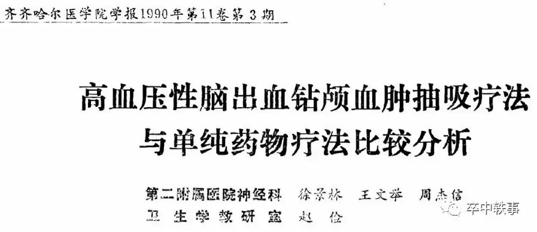 同年齐齐哈尔医学院附属二院神经科徐景林,王文举,周杰信和赵俭在院学报上发表了用14号脑穿针钻颅血肿抽吸疗法与药物疗法各30例比较(上图)。
