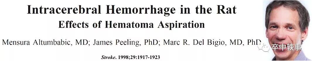 1998年加拿大的病理医生,脑出血研究专家 Marc Del Bigio 团队在 Stroke 报道了在大鼠胶原酶脑出血模型上超早期血肿清除的长期影响:“大鼠脑出血,抽吸血肿的疗效 - Intracerebral Hemorrhage in the Rat, Effects of Hematoma Aspiration”(上图)。