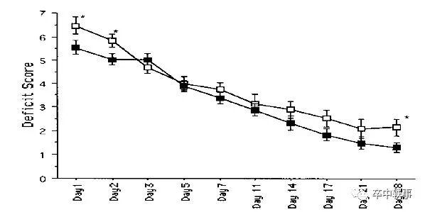 神经功能检查发现在28天内清除血肿对大鼠几乎无帮助,只是在第1-2和第28天时比不清除血肿组有轻微改善(上图)。