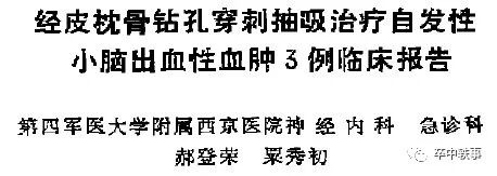 1990年第四军医大学神经内科和急诊科的郝登荣和粟秀初在《中国神经精神疾病杂志》报道了3例经皮枕骨钻孔穿刺抽吸治疗自发性小脑出血性血肿(上图),都是急性期手术。