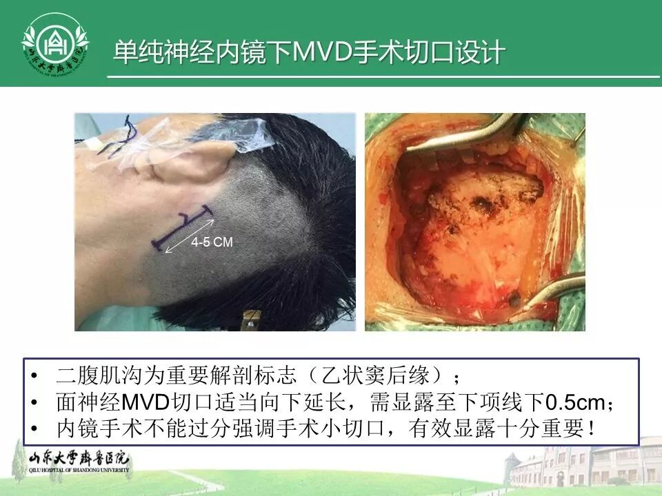 三叉神经显微血管减压操作: 以显微剪刀及剥离子解剖面听神经与岩静脉之间的蛛网膜,向内探查可见三叉神经。仔细观察三叉神经全长尤其是根部周围可能的责任血管,剥离子试验性分离后,枪状镊子置入垫片,剥离子调整垫片至三叉神经与责任血管之间,如此反复置入2-3块垫片以充分隔离三叉神经及责任血管。 切口标记与显露过程中应以二腹肌沟为解剖标志,磨除二腹肌沟处骨质后可以显露乙状窦中上段外侧缘,相对于目前较多单位行三叉神经微血管减压使用的幕下小脑上外侧入路(显露横窦乙状窦拐角处),神经内镜操作下使用此显露方法有以下几个优势: (1)该入路距离脑池较近,配合仰卧侧头位及良好的麻醉控制可以实现无牵拉释放脑脊液。 (2)应用神经内镜从此入路可以避开岩静脉阻挡,经听神经与岩静脉之间的间隙到达三叉神经,进行深部操作,从而避免切断岩静脉行血管减压术。 (3)神经内镜下通过岩静脉与位听神经间隙可很好探查三叉神经脑池段全长,寻找可能的责任血管并进行三叉神经全程减压。 面神经显微血管减压操作: 以显微剪刀及剥离子解剖位听神经及后组颅神经之间的蛛网膜,将神经内镜置入位听神经与舌咽神经之间的间隙,重点观察面神经出脑干处(桥延沟)责任血管,剥离子试验性分离责任血管,枪状镊子置入垫片,剥离子调整垫片至责任血管与面神经出脑干处,如此反复置入2-3块垫片以充分隔离面神经出脑干处及责任血管。如术中行神经电生理检测,可记录到肌电图侧方扩散消失。 面肌痉挛的责任血管压迫区域一般仅限于面神经根处(面神经出脑干处),特别应着重探查面神经腹侧下方脑干处。面神经主干多被位听神经阻挡,通过位听神经与后组颅神经之间的间隙,神经内镜可以充分探查面神经根部及邻近脑干区域。 有学者提出经下项线下绒球下入路行面神经微血管减压术以避免垂直面听神经牵拉小脑造成术后听力下降,但此方法需自下而上进入目标区域后容易被后组颅神经阻挡,造成面神经根部区域探查操作困难。应用神经内镜可以明显的减轻对小脑及位听神经的牵拉,从理论上讲可以明显较少术后听力下降及面瘫的发生率。术中应特别注意保护位听神经附近的细小血管以及不必要的反复牵拉操作面听神经主干,一般来说,面神经主干伴行血管以及穿行于面听神经之间的血管不考虑为责任血管。 关闭切口: 使用5-0可吸收线下以“不透水”方式严密缝合硬脑膜,再次确认乳突气房封闭良好,六孔钛板修补骨窗缺损,7号丝线缝合肌肉及筋膜层,3-0可吸收线缝合皮下,订皮机订皮。
