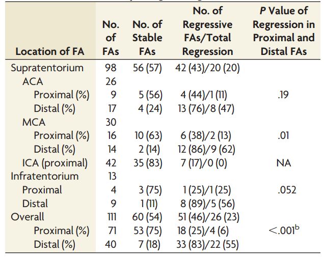 所有血流相关动脉瘤均较小(平均直径 4.1 mm;范围:2-9 mm)。存在 72 例近端血流相关动脉瘤(平均直径4.3 mm)和 39 例远端血流相关动脉瘤(平均直径3.7 mm)。远端血流相关动脉瘤的自发性血栓形成发生率高于近端血流相关动脉瘤。然而,在大脑前动脉(ACA)区域和幕下FAs中,近端与远端 FA 闭塞率并没有显著性差异。更小的血流相关动脉瘤(<5 mm)脑动静脉畸形闭塞后倾向于发生自发性闭塞(表3)。