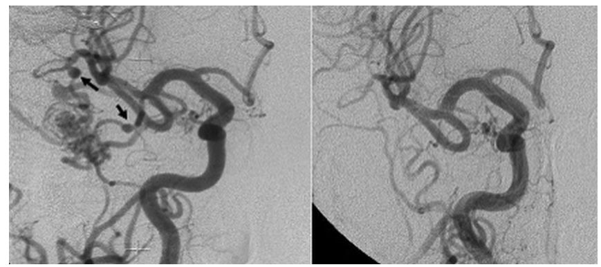 病例三:左图提示该患者的右侧大脑中动脉的 M2 节段存在右侧颞下 BAVM 和 2 处远端 FAs(箭头)。右图显示GKS 治疗37 个月后远端 FAs 完全闭塞,流经 BAVM 和 FAs 供血血管的血流正常化。