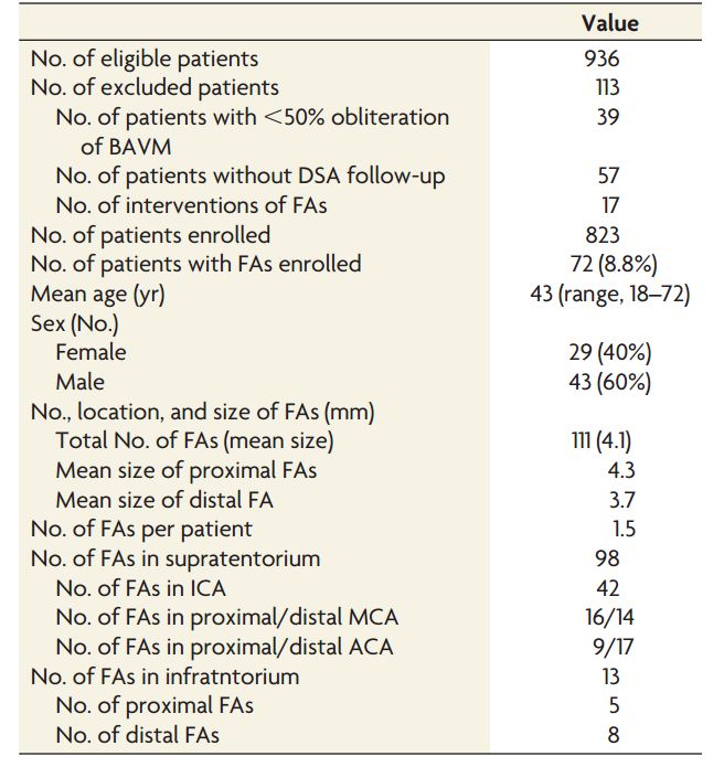 表1. 入组的 BAVM 患者的人口统计学和 FAs 特征