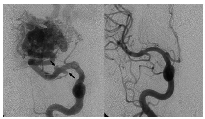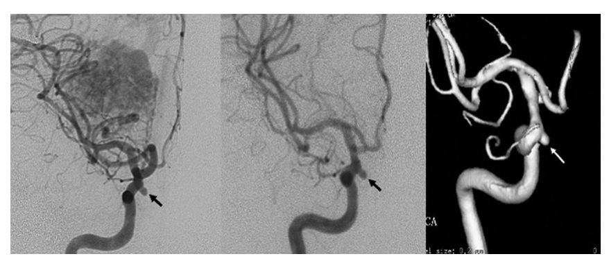 病例一:左图显示该患者为右侧顶枕叶AVM,右侧床突旁颈内动脉处存在小的血流相关动脉瘤(箭头)。中图及右图提示立体定向 γ 刀手术后 54 个月的常规血管造影显示 BAVM 几乎完全闭塞,但是近端 FA 没有明显的形态变化。