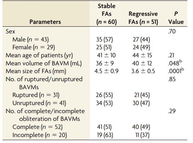 表2. 放射手术后 72 例 BAVM 患者中 111 个 FAs 的统计学资料