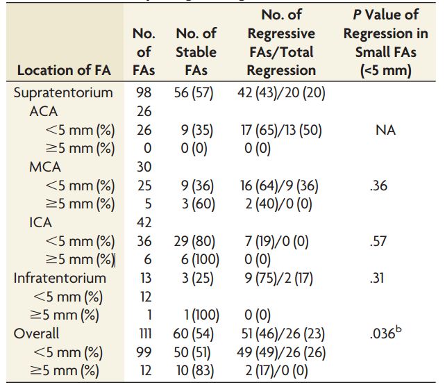 小于 5 mm的 FAs(与较大的 FAs 对比)的尺寸在复查中体积趋向于缩小(49% 与 17%),但 MCA、ICA和幕下FAs在单个区域中两组之间的回归差异无统计学显著性(表4)。2 例患者分别在临床随访的第 27 个月和第 54 个月发生近端 FAs(基底动脉尖和 ICA)破裂,1 例破裂与致死性 SAH 相关。